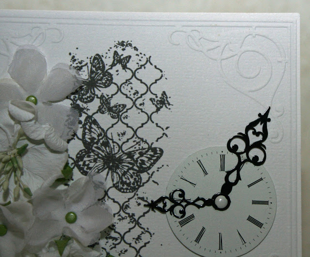 Stämpeln med nätet och fjärilarna är från Kaisercraft Texture Clear Stamps som jag stämplat med Memento Ink Pad Espresso Truffle. Från Prima kommer klockdekorationen och visarna. Blommor med pistiller från Reprint.