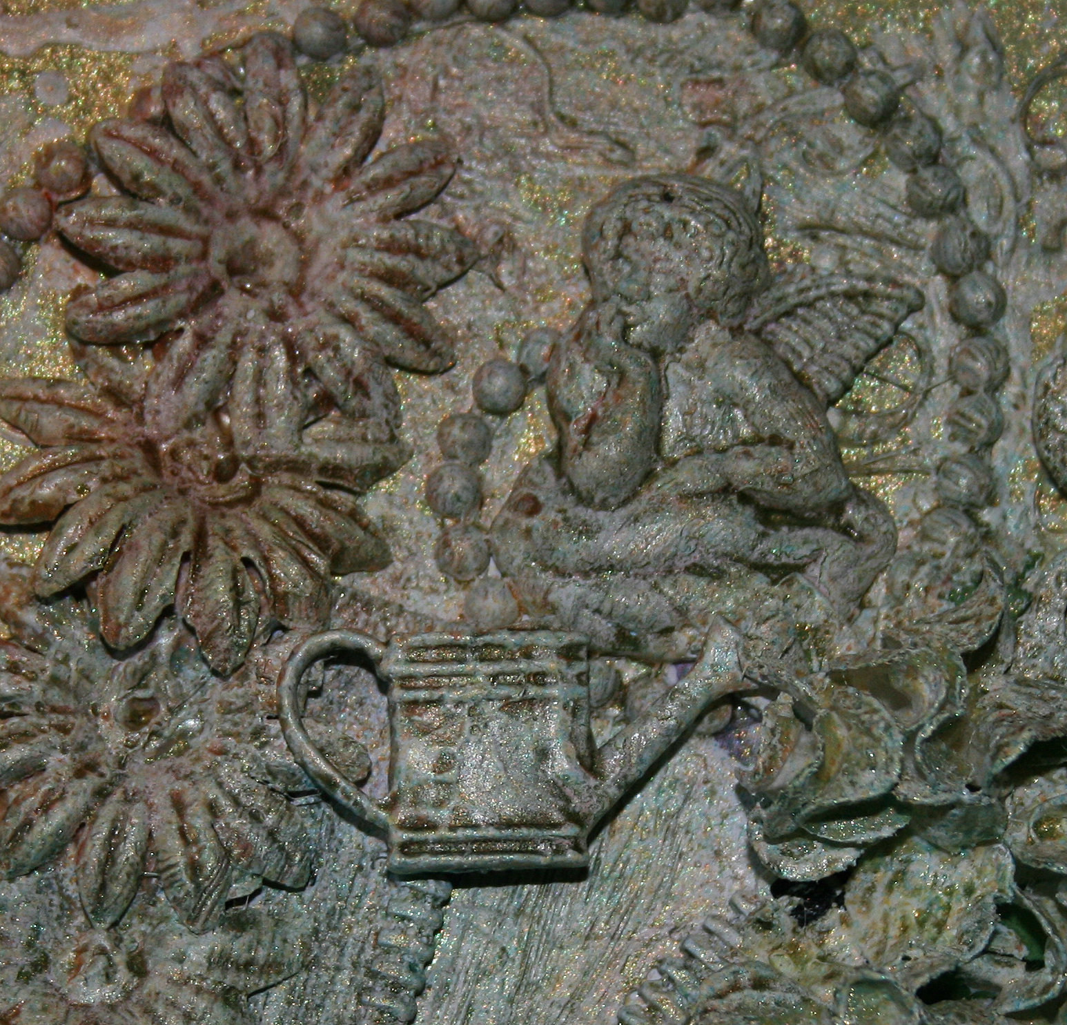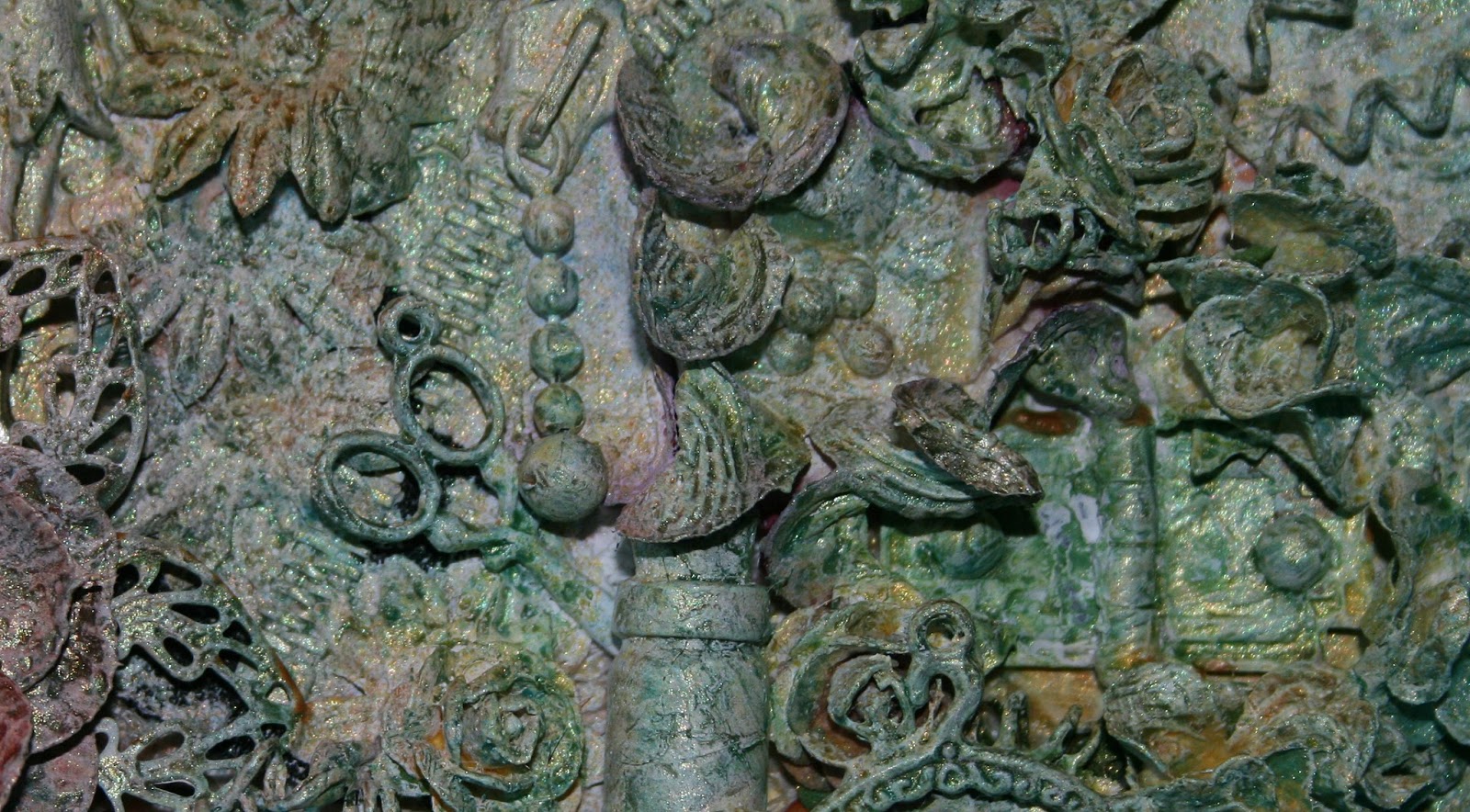 Detta är ett kul sätt att jobba på, man kan använda mycket saker i olika färger för överallt har jag målar med vit Gesso och sedan sprayat med några färger från Hedi Swapp color shine. Här en gammal svart dragkedja, en sax i brunt och ett gångjärn i grönbrunt.