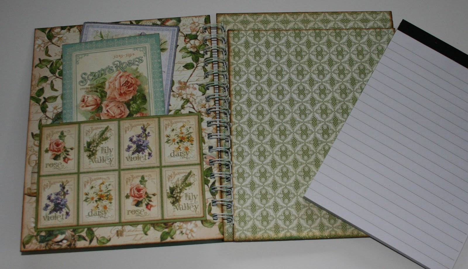 Klätt alla sidorna med mönsterpapper från Graphic 45 serie Secret Garden och gjorde en liten ficka på insidan. Satte ihop pärmarna med Bian.