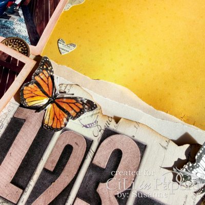 Jag rev några remsor av vellumpappret som jag stack in lite här och där, fäste lite olika stickers (bla Blommor)och klippte ut en massa fjärilar från mönsterpappret #26006 som jag limmade fast.