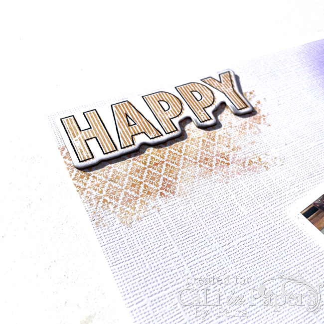 Jag råkade tappa min dabber så att jag fick ett svart streck i ena hörnet. det fixade jag enkelt med lite rum-ons och en titel HAPPY. Happy misstake kanske man kan säga.