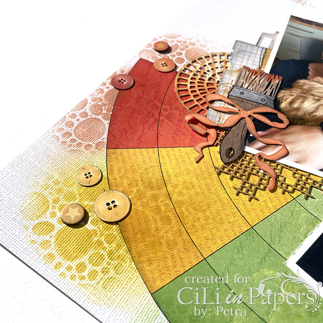 Det som blev kvar från ett av mönsterpapperen hade på baksidan härliga cirklar som jag klippte ut och limmade fast mellan dom olika lagrena lite här och där.